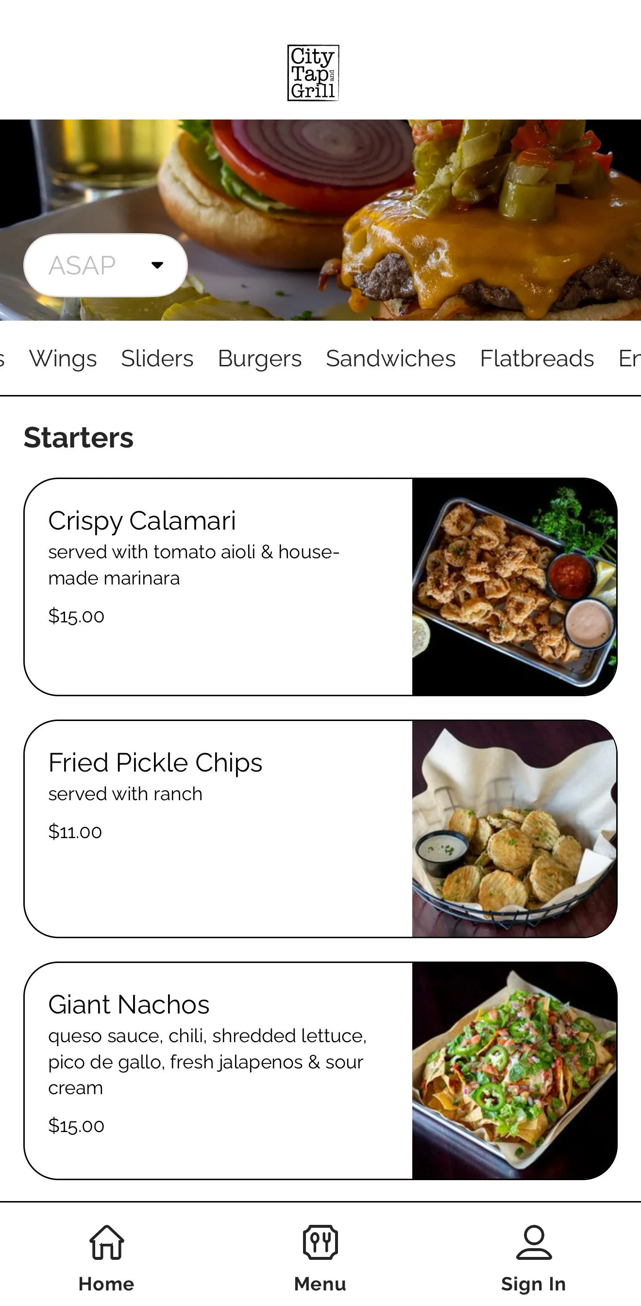 The City Tap and Grill app for iOS and Android is the most convenient way to get fresh, craveable, feel-good food on demand. Download the app and order for pickup or delivery and save on fee and third party fees.